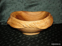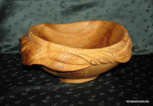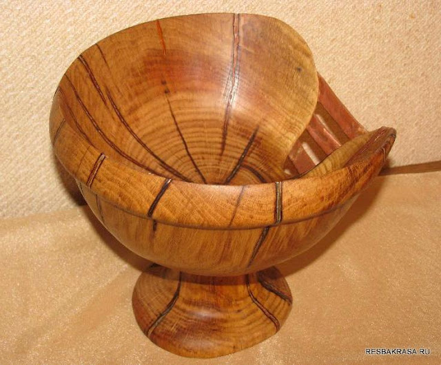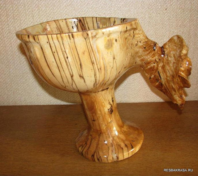О гниении древесины я писал .Сейчас только напомню, что окрашивают подгнившую древесину особые деревоокрашивающие грибы.Цвет и текстура такой древесины могут быть очень своеобразными и разными : от белого цвета до темно-бурого с зеленоватым, синим, желтым оттенками и со сложным узором тонких коричневых и черных нитей.Вот это и делает подгнившую древесину привлекательной для резьбы по дереву и для токарных работ по дереву.(Об особенностях точения ослабленной древесины можно прочесть ).Особенно красивы из такого материала различные резные вазы, чаши, тарелки и проч.Блуждая по полям Рунета, я мало видел изделий из подгнившей древесины.Причем чаще всего это стабилизированные кусочки шпальта, которые идут на изготовление рукояток для ножей.Есть токарные работы по шпальту, ручной резьбы практически нет.