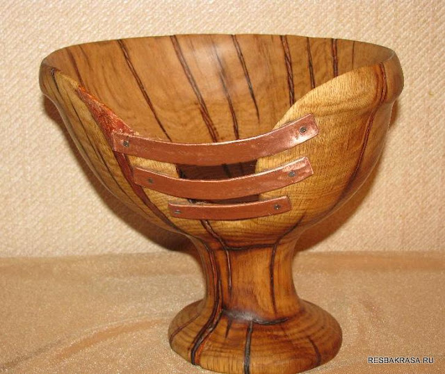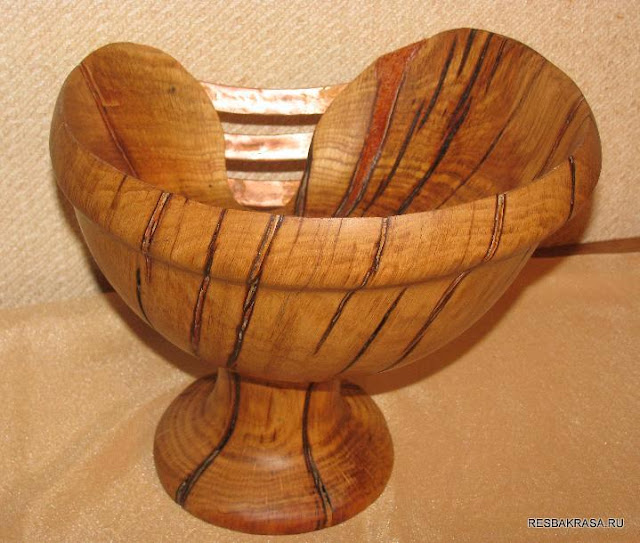 №3.Третья ваза из шпальта, на этот раз из комлевой части засохшего на корню дуба.Если первая ваза из дуба располагалась поперек годовых колец, то эта вдоль.На боковую часть вазы пришлась полоска совсем трухлявой древесины.Я как раз и рассчитывал на это : труху выберу, а образовавшуюся щель закрою железными полосками.По моему разумению, этот декоративный элемент оживит общий вид.Сушил на этот раз дуб подальше от батареи отопления, а бумаги намотал на заготовку побольше.Но и на этот раз без трещин не обошлось.Отделка — льняное масло и вощение.На этой третьей резной вазе заканчиваю первую часть рассказа о поисках красивой древесины.Кстати, все эти вазы можно посмотреть «вживую» .